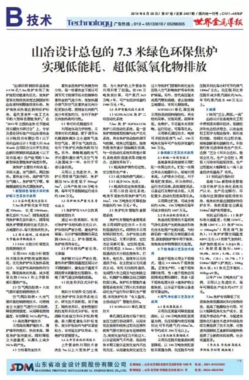 “SDM大型綠色智能焦?fàn)t技術(shù)”是山冶設(shè)計(jì)與意大利PW公司合作的代表世界一流工藝水平的大型焦?fàn)t技術(shù)。由山冶設(shè)計(jì)進(jìn)行整體規(guī)劃及設(shè)計(jì),采用了分段加熱、非對(duì)稱式煙道、薄爐墻、單孔調(diào)壓、火焰分析模型等技術(shù),具有技術(shù)成熟先進(jìn)、結(jié)構(gòu)嚴(yán)密合理、單孔容量大、占地面積小、熱工效率高、自動(dòng)化水平高、環(huán)保指標(biāo)先進(jìn)等諸多優(yōu)點(diǎn)。在焦?fàn)t爐體、焦?fàn)t機(jī)械、工藝裝備、自動(dòng)化和環(huán)保水平等方面代表國際先進(jìn)水平。同時(shí),在世界上首次運(yùn)用焦?fàn)t爐內(nèi)脫硝工藝,氮氧化物排放指標(biāo)符合國家最嚴(yán)環(huán)保排放標(biāo)準(zhǔn)。
