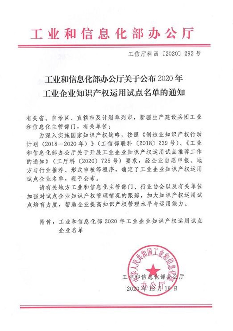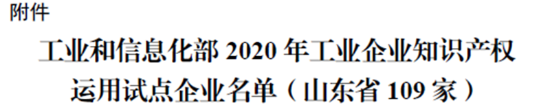 日前,國家工業(yè)和信息化部辦公廳發(fā)文公布,公司成功入選“2020年工業(yè)企業(yè)知識產(chǎn)權(quán)運(yùn)用試點(diǎn)單位”,山東省共入選109家知識產(chǎn)權(quán)運(yùn)用優(yōu)秀企業(yè)。