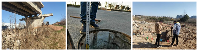 本次現(xiàn)場實測數據包含現(xiàn)狀鐵路橋橋墩坐標、橋梁凈空,已建設道路交叉口坐標及高程,已施工雨、污水井坐標及井深等,測量項目涉及到“陽邏之心”50多萬平方米二十余條道路,測量范圍廣闊,測量目標眾多,而測量人員僅為王學皓、吳修業(yè)及二十冶測量技術員陳工,實測任務異常艱巨。現(xiàn)場多為半施工或未施工道路,測量情況十分復雜,并同時遭遇武漢強降溫天氣,踏勘工作面臨極大考驗。尤其在雨污水井數據測量方面,部分道路車流量較大,需搭設臨時圍擋保證測量安全;部分重型井蓋受重載車輛碾壓密實變形,現(xiàn)有工具簡陋,僅打開井蓋這一項往往需要數十分鐘,完成單個井數據測量至少需要一個多小時,遠遠超出預估時間。與時間節(jié)點競速,測量人員踏霜踩露而出,披星戴月而歸,歷經四天全力以赴、克難攻堅,圓滿完成所有測量任務,為設計工作順利進行提供了有力的數據支持。
